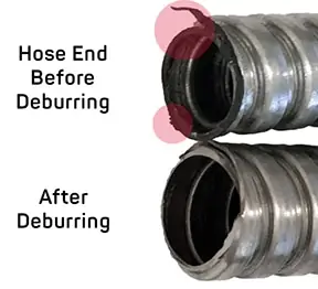 After cutting flexible conduit, it is critical to debur or finish the conduit, removing sharp edges and burrs.