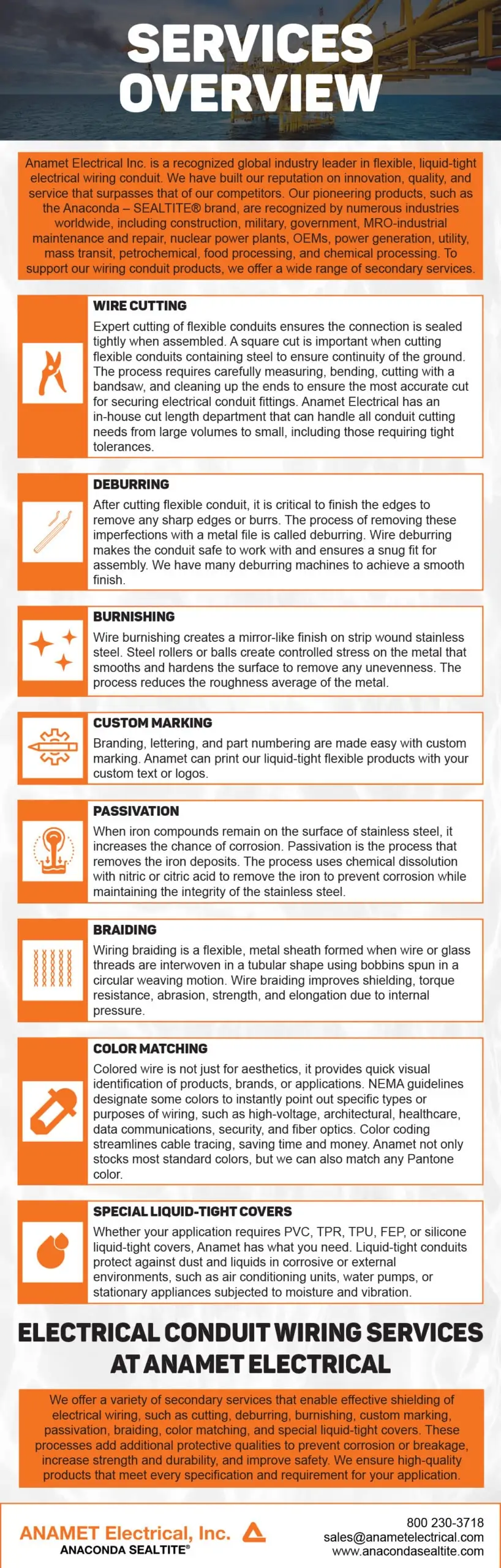 Contact us if you need a reliable design solution for protecting wiring, cables or instrumentation from harsh operating conditions. ANAMET Electrical can partner with you as your electrical conduit supplier, so you can concentrate on other product features. For more information, or to get started on your electrical wiring conduit project, contact us or request a quote today.